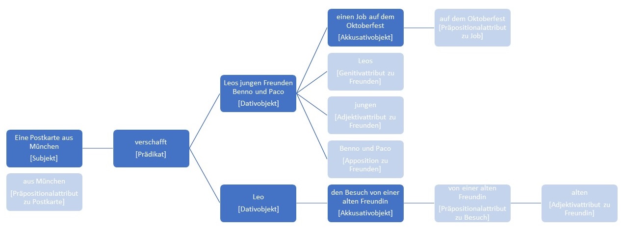 In diesem Ausgangsbeispiel besteht der Kern des ersten Dativobjekts in dem Wort Freunden. Dieses wird durch drei Attribute näher bestimmt: Das Adjektiv jung trifft eine Aussage über das Alter der Freunde. Bei den verknüpften Substantiven Benno und Paco handelt es sich um eine Apposition. Appositionen sind Attribute, die nominal realisiert werden. Mit diesem Attribut wird den Freunden ein Name gegeben. Das Genitivattribut Leos zeigt an, dass es sich bei Benno und Paco um Freunde von Leo handelt. Darüber hinaus wird der Job näher charakterisiert, den sie erhalten: Es handelt sich nämlich um einen Job auf dem Oktoberfest. Paraphrasiert man nun diesen ersten Teil, bedeutet der Satz: Es gibt zwei junge Männer: Benno und Paco. Beide sind mit Leo befreundet. Sie haben einen Job auf dem Oktoberfest erhalten. Der Grund für dieses Jobangebot besteht in einer Karte, die aus München gekommen ist.