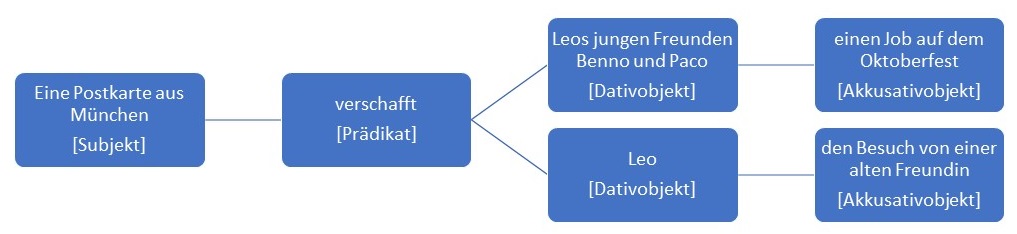 Zum einen verschafft die Postkarte den Personen Benno und Paco einen Job. Das heißt, dass hier Benno und Paco die Funktion des Dativobjekts übernehmen analog zu Lisa weiter oben. Auch sie erhalten einen Job. Zum anderen verschafft die Postkarte aber auch Leo etwas. Er übernimmt ebenfalls die Funktion derjenigen Person, die von einer Verschaffung profitiert. Anders als in den vorherigen Beispielen bekommt er keinen Job verschaffen, sondern einen Besuch.