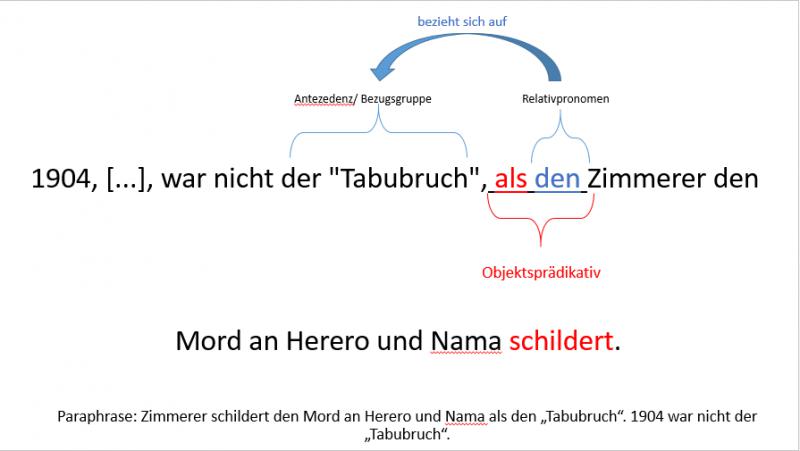 Der Nebensatz „als den Zimmerer den Mord an Herero und Nama schildert“ ist also ein Relativsatz zum übergeordneten Substantiv „Tabubruch“. Der Relativsatz beschreibt das Substantiv „Tabubruch“ näher. Ein derartiger Relativsatz wird als Attributsatz bezeichnet.