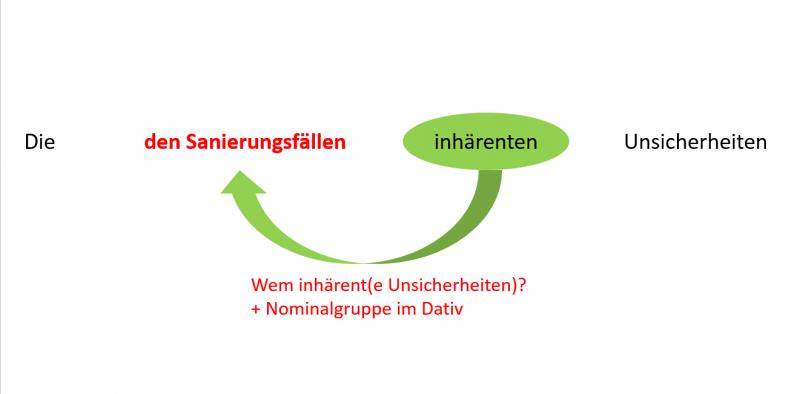 In einer Sprachgebrauchsanalyse bestätigt sich dies: Das Adjektiv „inhärent“ wird bei attributivem Gebrauch in der Regel nicht mit einer Präpositionalgruppe kombiniert (ihr Vorschlag: „die in den Sanierungsfällen inhärenten Unsicherheiten“), sondern mit einer Nominalgruppe im Dativ („Die den Sanierungsfällen inhärenten Unsicherheiten“).